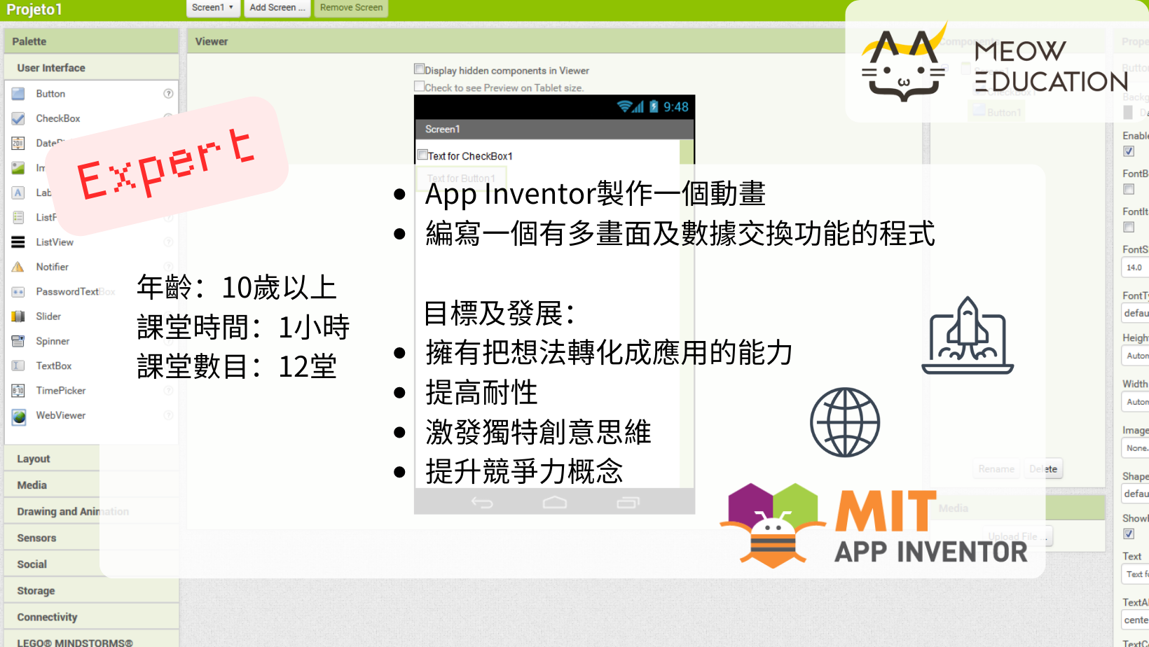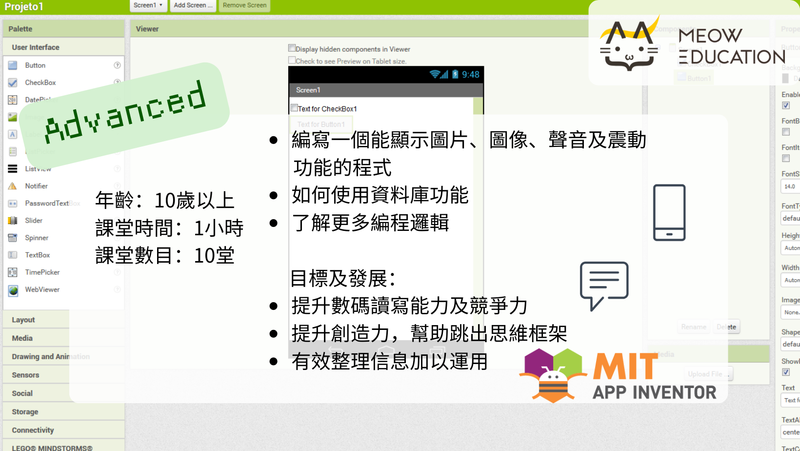 MIT App Inventor 旨在學習 Android 裝置程式設計,省略較為艱澀的 Java 語法,只要使用積木拼圖組合程式,就可以完成 Android 裝置的應用程式,完成作品後還可以上傳到 Google Play 商店,提供給大眾下載使用。